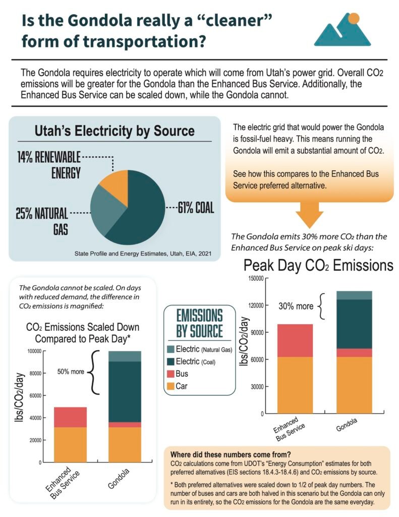 Based off of numbers in UDOT’s EIS, the Gondola will emit more CO@ than the Enhanced Bus Service on a peak day. When demand is lower than peak days, a bus-based transit solution can be scaled down whereas the Gondola cannot.